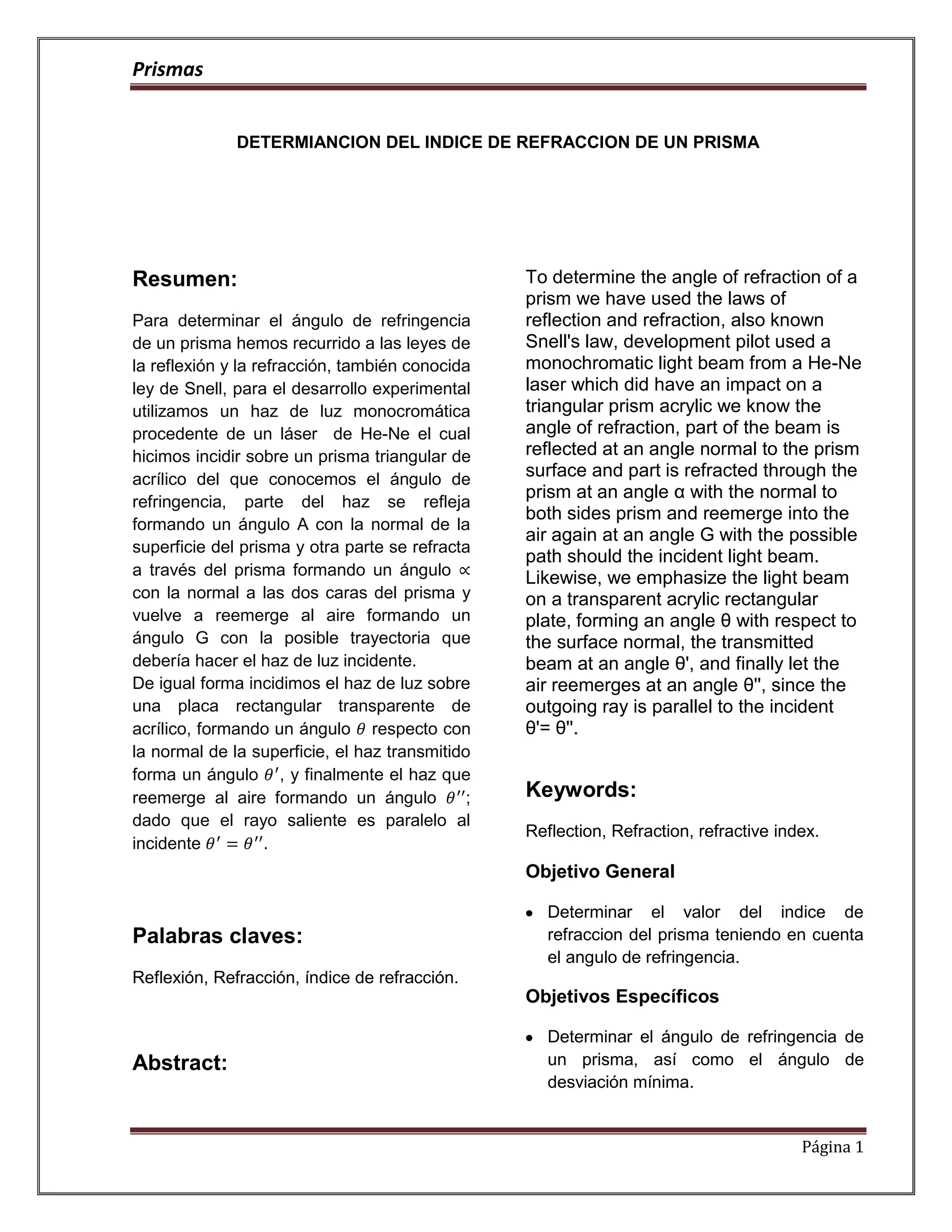 Para determinar el índice de refracción de un prisma triangular y rectangular, se utilizó un láser de He-Ne y las leyes de reflexión y refracción. Midiendo el ángulo de desviación mínimo en el prisma triangular y el desplazamiento lateral de un haz al atravesar la placa rectangular, se pudo calcular el índice de refracción experimentalmente y compararlo con el teórico para el acrílico.