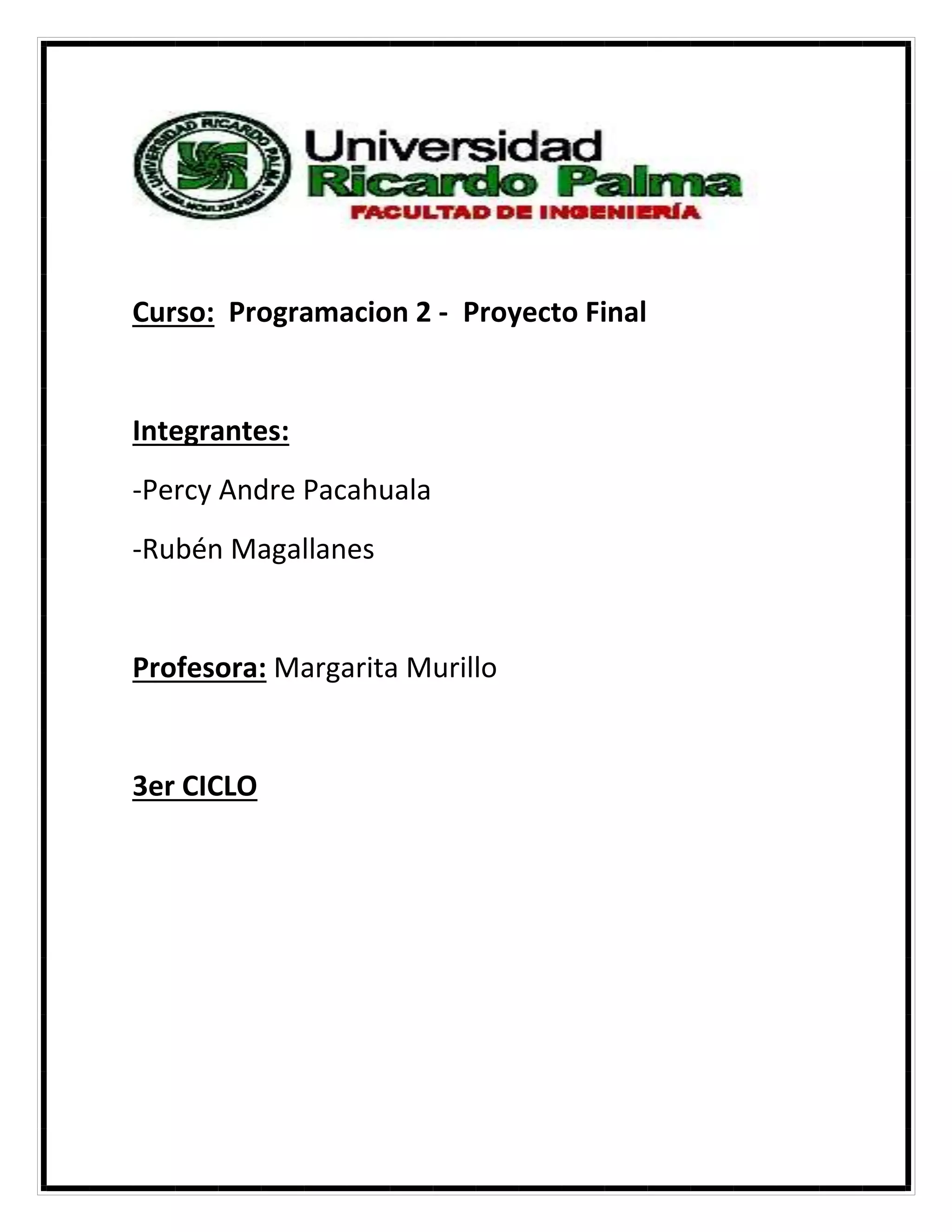 El documento presenta un proyecto final de estudiantes de Programación 2 sobre un estacionamiento automatizado. El proyecto busca solucionar problemas de estacionamiento e implementar una idea innovadora en el Perú. El estacionamiento tendría capacidad para 14 vehículos pero usaría solo 2 espacios con sensores infrarrojos. Contaría con alarmas contra incendios y ventilación. El costo total del proyecto fue de 150 soles.