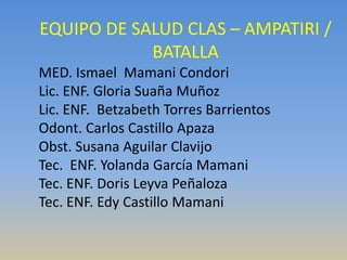 Este documento presenta el informe anual de promoción de la salud del equipo de salud CLAS de Ampatiri y Batalla para el año 2008. Resume los programas y actividades realizadas durante el año para promover estilos de vida saludables a nivel de familias, escuelas y municipios, incluyendo reuniones con agentes comunitarios de salud y tres encuentros de familias y viviendas saludables en diferentes comunidades.