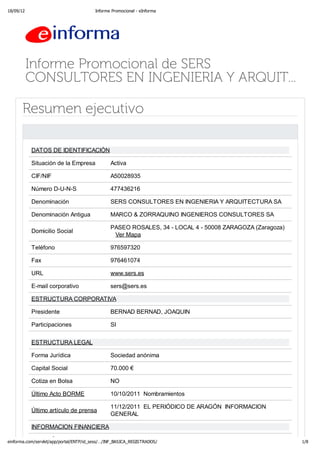 Este documento proporciona información sobre SERS CONSULTORES EN INGENIERIA Y ARQUITECTURA SA, una empresa de ingeniería y arquitectura con sede en Zaragoza. Incluye detalles sobre su estructura corporativa, legal y financiera, así como su actividad comercial. Además, presenta artículos de prensa relacionados y ofrece diferentes informes adicionales de pago sobre la empresa.
