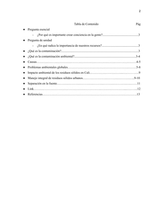 Este documento trata sobre la contaminación ambiental causada por el mal manejo de basuras y residuos sólidos en la ciudad de Santiago de Cali. Explica que la contaminación se produce por el aumento de la población y el desarrollo industrial, causando desequilibrios ambientales. También describe algunos problemas ambientales globales como el cambio climático y la deforestación. Finalmente, analiza el impacto de los residuos sólidos en Cali y la importancia de su manejo integral, incluyendo la separación en la fuente.