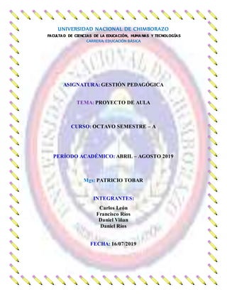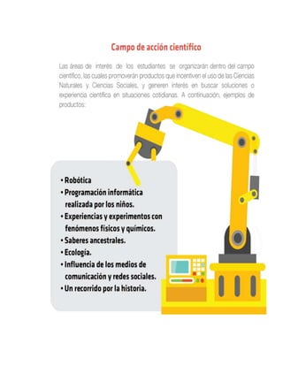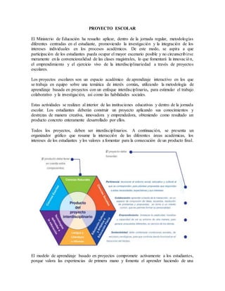 El documento habla sobre la implementación de proyectos escolares en las instituciones educativas ecuatorianas. Los proyectos escolares son espacios de aprendizaje interactivo donde los estudiantes trabajan en equipo en una temática de interés común de manera interdisciplinaria para desarrollar habilidades. El Ministerio de Educación promueve esta metodología para fomentar la investigación, la innovación y el aprendizaje basado en experiencias prácticas.