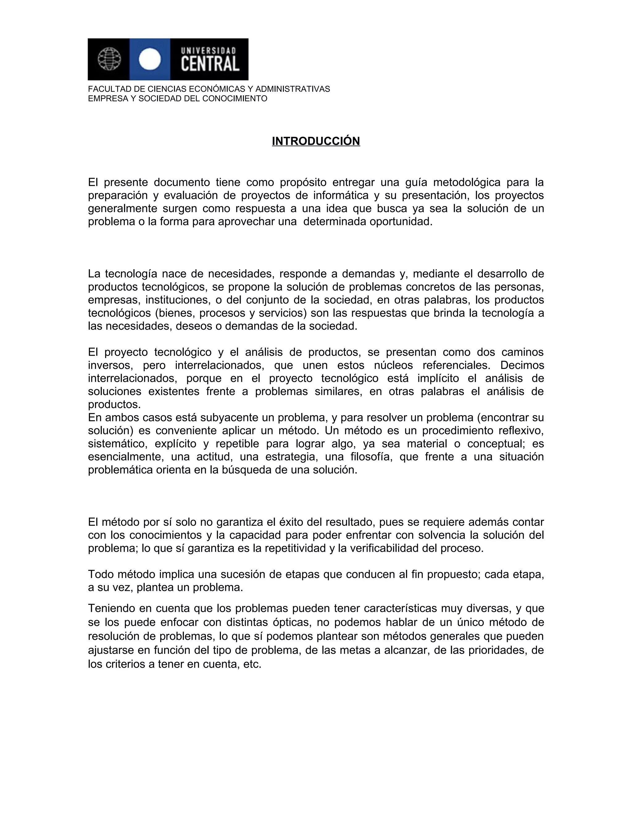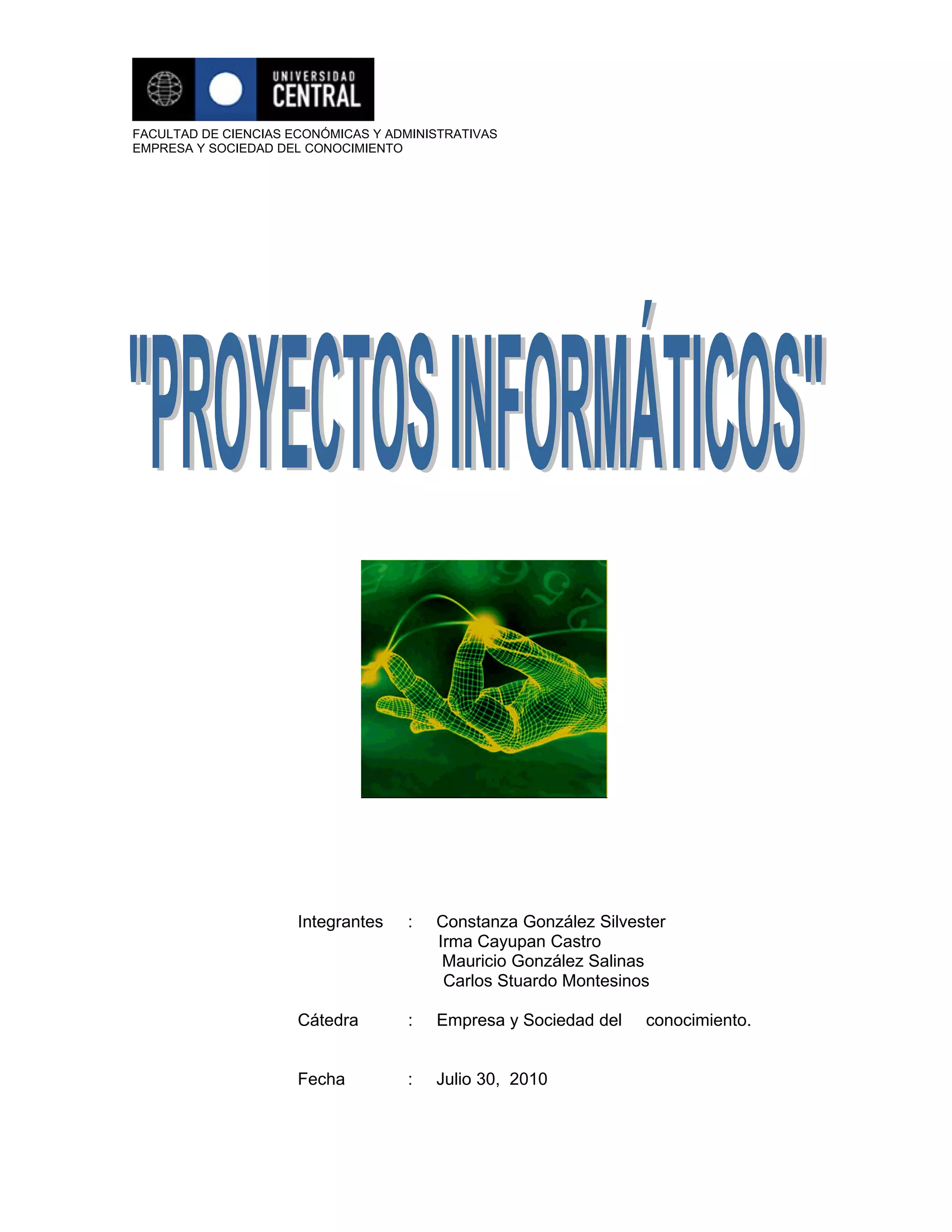 El documento presenta una guía metodológica para la preparación y evaluación de proyectos de informática. Explica que los proyectos surgen para resolver problemas o aprovechar oportunidades. Define un proyecto informático como la búsqueda de resolución de intereses o problemas a través de una propuesta desarrollada en etapas que produce un resultado final. También describe los objetivos de los proyectos, los tipos de proyectos, y los sistemas de gestión de proyectos incluyendo la planificación, información, control, técnicas