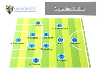 Este documento analiza al próximo rival, incluyendo su alineación, estilo de juego, organización ofensiva y defensiva, y estrategia en balón parado. Se destacan las debilidades del equipo en la transición defensiva, construcción corta, y defensa del segundo palo. La propuesta se enfoca en explotar estas debilidades y aprovechar las fortalezas propias en la transición.