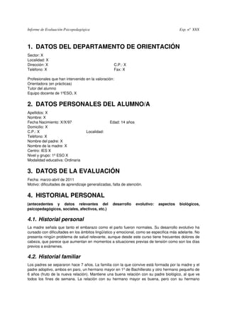 Este informe de evaluación psicopedagógica describe la evaluación de un estudiante de 14 años que está teniendo dificultades de aprendizaje. La evaluación incluyó pruebas de inteligencia, lectura, atención y habilidades sociales. Los resultados mostraron que el estudiante tiene capacidad intelectual promedio, pero tiene dificultades con la atención y la memoria de trabajo que están afectando su aprendizaje. El informe proporciona antecedentes familiares y escolares relevantes, y analiza los resultados de las pruebas individual