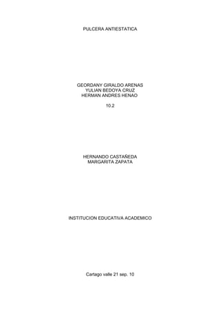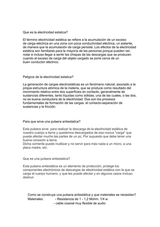 Este documento describe cómo construir una pulsera antiestática usando materiales como una resistencia de 1-1.2 Mohm, cable coaxial, cinta elástica y velcro. Explica que la pulsera conduce la electricidad estática del cuerpo a tierra para proteger componentes electrónicos de daños. Incluye instrucciones detalladas sobre cómo ensamblar los componentes de la pulsera y asegurarse de que haga buen contacto con la muñeca para descargar la electricidad estática de manera segura.