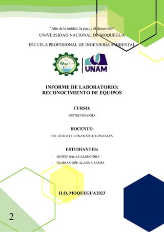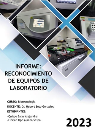 Este informe describe los equipos de biología molecular utilizados en el laboratorio de Biotecnología de la Universidad Nacional de Moquegua. Se describen nueve equipos principales, incluyendo agitadores térmicos, minicentrífugas, espectrofotómetros, termocicladores y centrifugadoras. Cada equipo se describe detallando sus funciones, características y especificaciones técnicas, así como sus aplicaciones en investigaciones biomoleculares. El objetivo del informe es proporcionar una visión general de los equipos disponibles para for