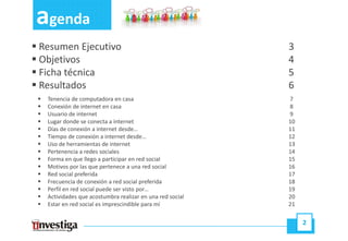 El estudio de redes sociales en Trujillo, realizado por la universidad privada Antenor Orrego, revela que el 55% de los trujillanos tiene computadora en casa y el 71% conexión a internet, con un 82% de usuarios accediendo a internet principalmente desde cabinas públicas. El 74% de los encuestados pertenece a al menos una red social, siendo hi5 y Facebook las más populares, y la mayoría se unió por invitación de amigos. Las actividades más comunes en redes sociales son subir fotos y videos, comentar publicaciones y chatear, con un 54% de los participantes considerando imprescindible su presencia en estas plataformas.