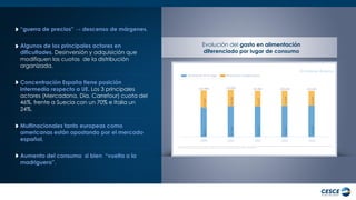 Este documento resume la situación actual del sector de la distribución alimentaria en España. Los tres principales actores (Mercadona, Día y Carrefour) controlan el 46% del mercado. La marca de distribuidor ha seguido creciendo pero a menor ritmo, representando el 42,8% de las ventas en 2013. El canal minorista con mejores precios (Día y Lidl) está mejor posicionado, seguido por los supermercados (Mercadona a la cabeza). El sector HORECA se ha visto afectado por una disminución