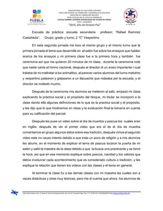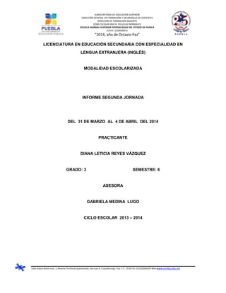 El documento describe el informe de la segunda jornada de práctica de una estudiante de licenciatura en una escuela secundaria. La estudiante impartió clases sobre ensayos a un grupo de 2° grado. Observó las clases de su maestra titular y notó falta de motivación en los alumnos. La estudiante aplicó diferentes actividades como videos y debates para enseñar sobre tradiciones como el Día de Muertos. Concluyó que la práctica docente es una experiencia de retroalimentación entre maestros y alumnos.