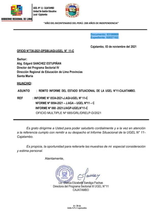 Este informe presenta un resumen del estado situacional del Área de Gestión Institucional de la UGEL No 11-Cajatambo al 30 de setiembre de 2021. Se informa que se han cumplido con las acciones de planificación institucional requeridas, como la formulación y evaluación de planes operativos, presupuesto y seguimiento de políticas educativas nacionales. Asimismo, se adjuntan los cuadros y formatos correspondientes al proceso de planificación educativa llevado a cabo en la unidad de gestión durante el periodo informado