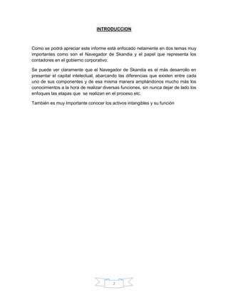 El documento resume el informe sobre el Navegador de Skandia, una herramienta desarrollada por la compañía de seguros sueca Skandia para medir su capital intelectual. El Navegador divide el capital intelectual en cinco enfoques: financiero, clientela, humano, procesos y renovación. Proporciona una visión del pasado, presente y futuro de la empresa considerando factores tanto financieros como no financieros. El modelo ha sido reconocido por su capacidad de medir de manera práctica el valor sostenible de una