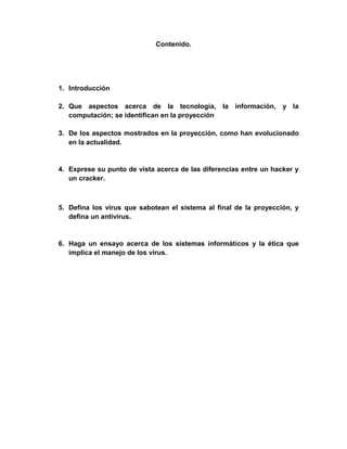 Este documento presenta un informe sobre aspectos relacionados con la tecnología, la información y la computación mostrados en una proyección sobre hackers. Identifica varios aspectos como el manejo de información en redes, la vulnerabilidad de sistemas y el uso de virus. Explica cómo han evolucionado estos aspectos y la seguridad informática. Define la diferencia entre hackers y crackers, virus informáticos y antivirus. Finalmente, hace un ensayo sobre la ética en el manejo de virus informáticos.