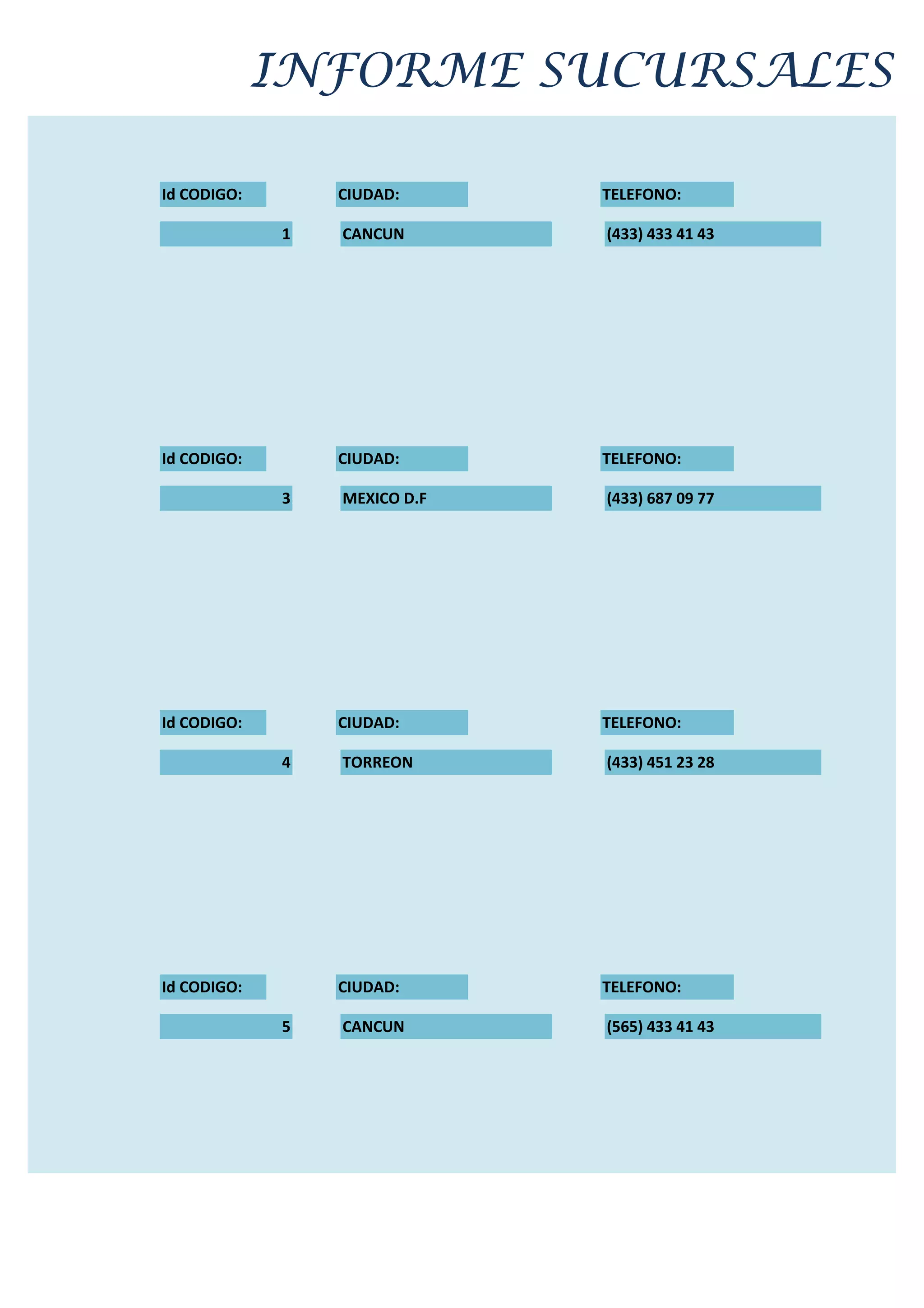 El documento proporciona información sobre 20 sucursales de una empresa incluyendo su identificador, ciudad y número de teléfono. Las sucursales se encuentran en diversas ciudades de México como Cancún, México D.F., Torreón, Guadalajara y Monterrey.
