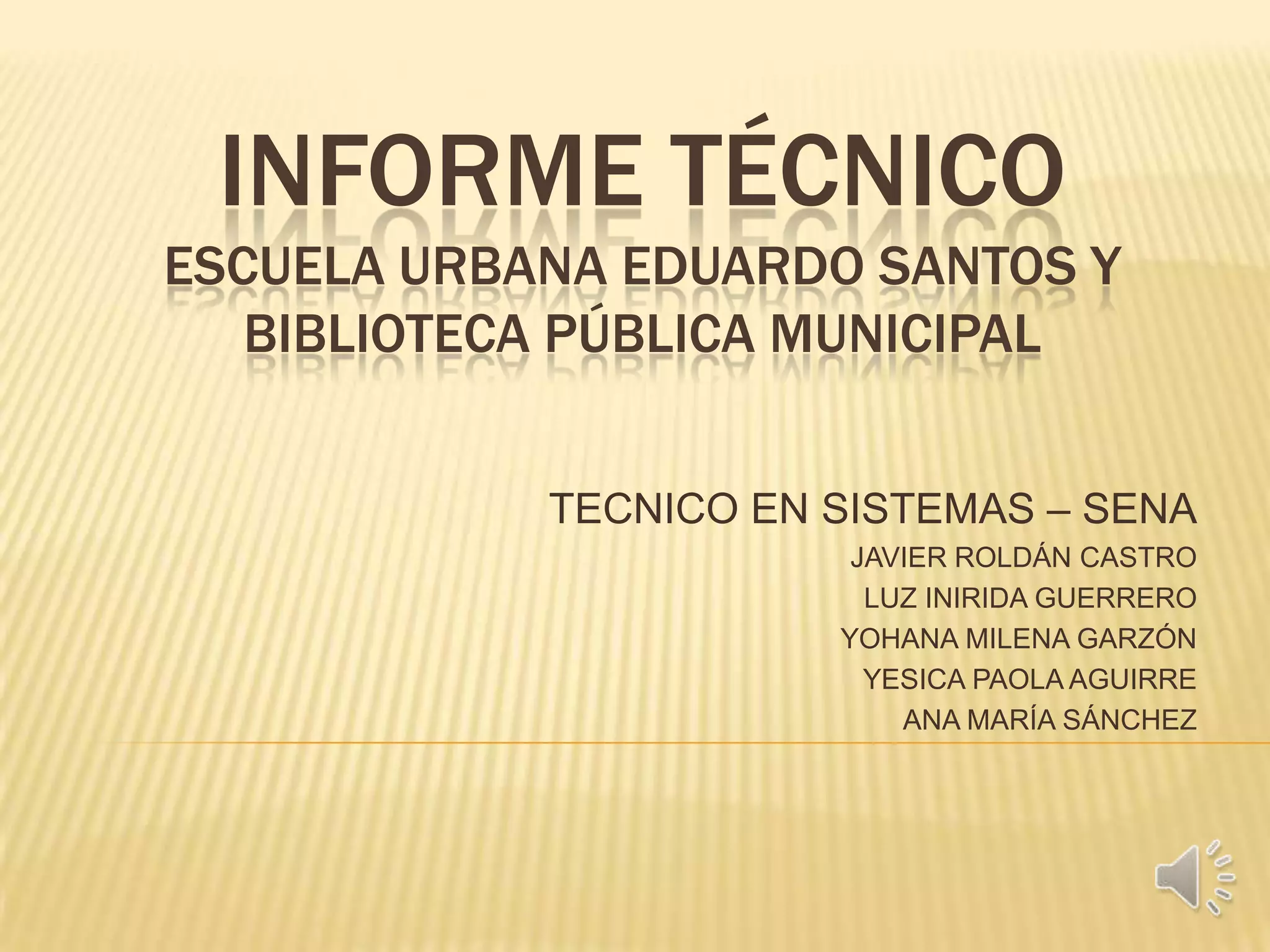 El resumen analiza el estado de la sala de sistemas de la Escuela Urbana Eduardo Santos y la biblioteca pública municipal de Topaipí, Cundinamarca. Se identificaron deficiencias como equipos dañados y falta de puntos de red. La propuesta incluye ampliar la red, mejorar el espacio físico, actualizar software y agregar más equipos para mejorar el acceso a la tecnología.