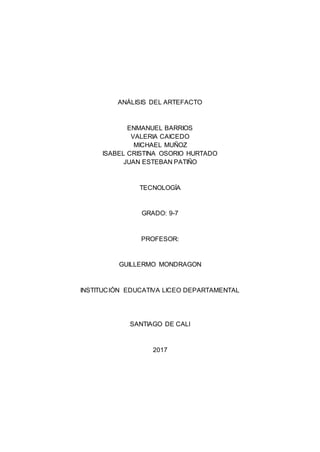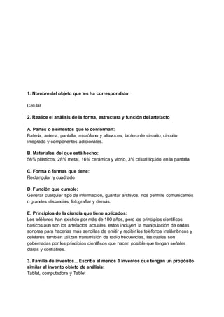 Este documento presenta el análisis de un celular realizado por estudiantes de grado 9 como proyecto escolar. Describe las partes del celular, los materiales que lo componen, su forma y función principal de comunicación y almacenamiento de información. Explica que aplica principios científicos como las ondas de sonido y radiofrecuencias. Compara al celular con inventos similares como la tableta y computadora.