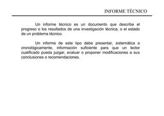 Este documento proporciona información sobre los informes técnicos. Explica que un informe técnico describe los resultados o progreso de una investigación técnica o el estado de un problema técnico. Detalla las secciones que debe contener un informe técnico como la portada, resumen, índice, cuerpo del informe y anexos. Además, describe los elementos que debe incluir cada una de estas secciones para proporcionar la información de manera clara y organizada.