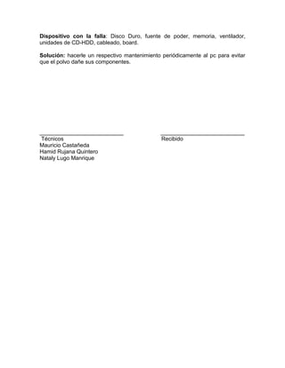 El documento describe un informe técnico sobre la reparación de una torre de computadora marca Janus que tenía gran cantidad de polvo dentro, lo que dañaba sus dispositivos y evitaba que el ventilador girara correctamente. Para solucionarlo, los técnicos desarmaron completamente la torre, limpiaron cada uno de sus componentes como la fuente de poder, memoria y unidades con brochas y sopladores, y luego volvieron a armarla. La solución propuesta fue hacerle mantenimiento periódico a la torre para evitar que el polvo dañe