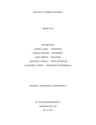 Este documento presenta información sobre circuitos eléctricos y energía. Explica las partes de un circuito eléctrico como generadores, conductores, receptores, elementos de control y protección. También describe cortocircuitos, clases de circuitos, y el impacto de la energía en el medio ambiente y la vida humana. El documento concluye que se investigaron los diferentes aspectos de los circuitos eléctricos y la influencia de la energía.