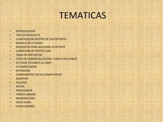 Este documento resume los principales componentes y características de un computador. Explica que un computador es una máquina electrónica que procesa datos para proveer información útil, y enumera sus componentes clave como el monitor, teclado, ratón, procesador, tarjeta madre, memoria RAM y disco duro. También discute brevemente temas como la clasificación de patentes, modelos de utilidad, requisitos para patentes, y leyes aplicables a la comercialización y venta de computadores.