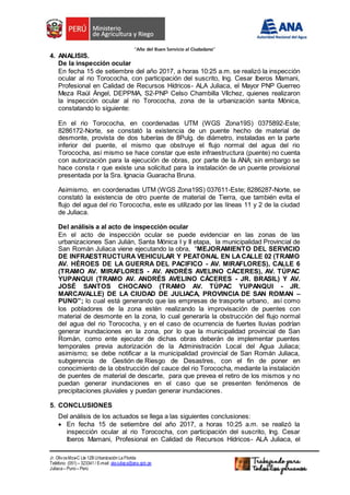 El documento presenta el informe de una inspección ocular realizada al río Torococha en Perú. La inspección encontró que puentes improvisados de material de relleno obstruyen el flujo normal del río, lo que podría causar inundaciones. Se recomienda notificar a las autoridades municipales para que implementen puentes temporales autorizados y retiren los puentes existentes para prevenir inundaciones.