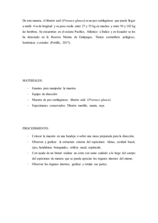 El documento describe la disección de un tiburón azul (Prionace glauca). Se identificaron las estructuras externas e internas del tiburón, incluyendo las aletas, órganos reproductivos, sistema digestivo y más. El tiburón azul es un pez cartilaginoso ovovivíparo que se encuentra en el océano Pacífico, Atlántico e Índico. La disección reveló detalles importantes sobre la anatomía y fisiología de esta especie.