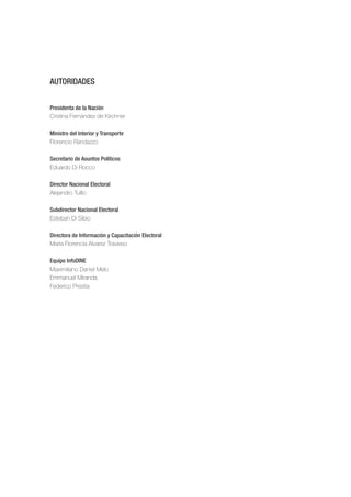 Este documento proporciona información sobre las próximas elecciones presidenciales y legislativas en Uruguay el 26 de octubre de 2014. Detalla la forma de gobierno, los cargos a elegir, las autoridades electorales, el sistema de votación, los derechos de participación y las cuotas de género. También describe la composición y mandatos del poder ejecutivo y legislativo uruguayos.