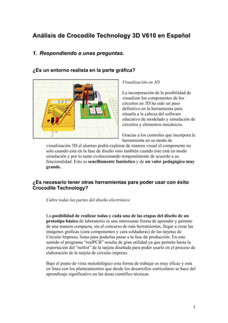 El documento analiza el software de simulación Crocodile Technology 3D V610. Resalta su capacidad para visualizar circuitos y componentes en 3D de forma realista, cubrir todas las etapas del diseño electrónico sin necesidad de otras herramientas, y contar con una amplia librería de componentes. También permite programar automatismos mediante diagramas de flujo y es fácil de aprender gracias a su tutorial interactivo.