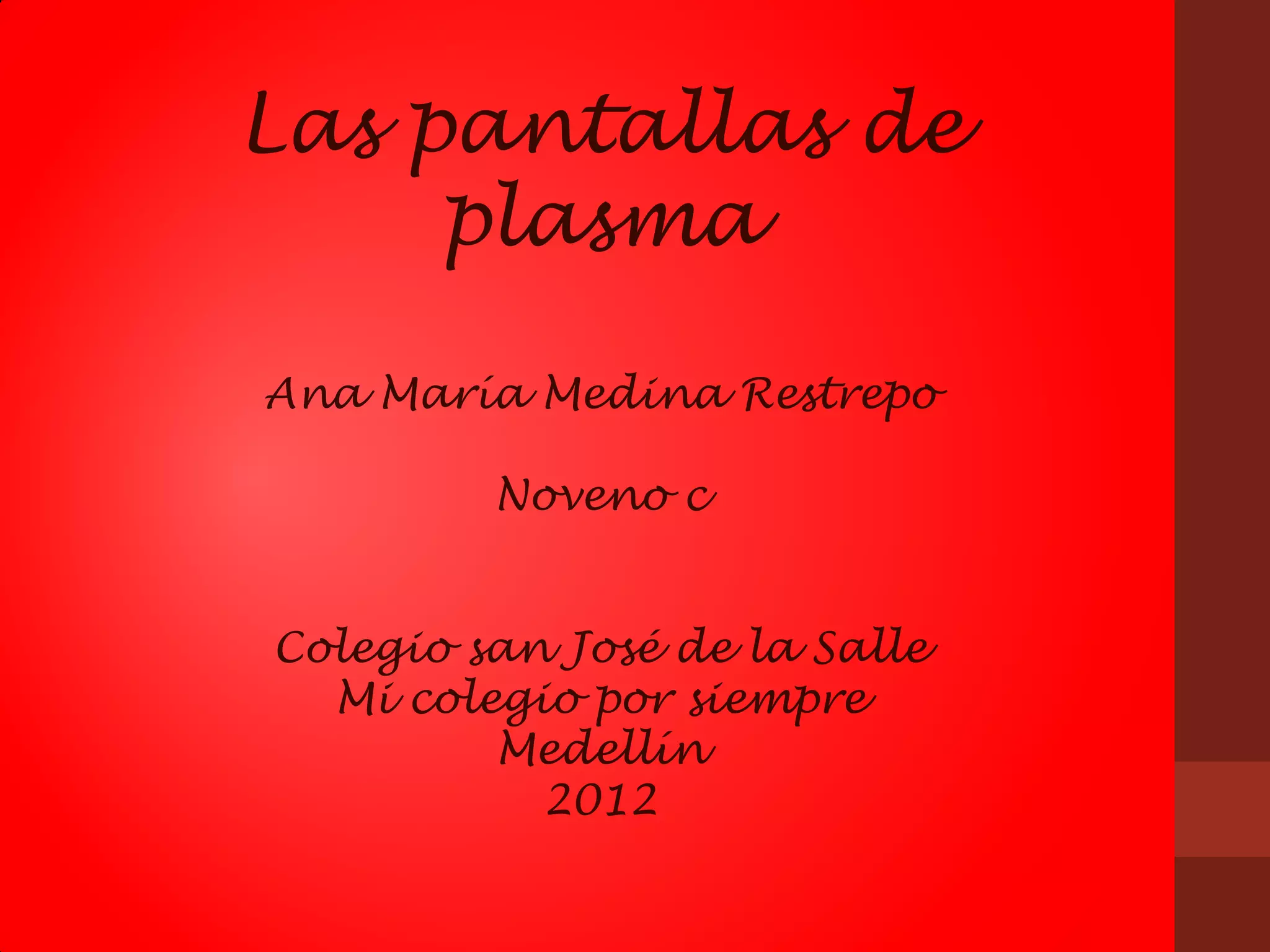 El documento describe las pantallas de plasma, las cuales están compuestas de gases comprimidos de neón y xenón inyectados en celdas de cristal que emiten luz. Explica que tienen circuitos para sonido y señal y que pasan pruebas de seguridad. Además, opina que las pantallas plasma son prácticas debido a su delgadez y imagen nítida, y que la tecnología televisiva continúa mejorando para satisfacer las necesidades de los consumidores.