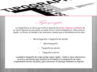 El documento describe la historia y evolución de los alfabetos y la tipografía desde sus orígenes en Mesopotamia hasta la actualidad. Comenzó con pictogramas sumerios hace aproximadamente 3500 años, luego se desarrollaron los primeros sistemas de escritura cuneiforme y silábico. Los fenicios adoptaron un alfabeto egipcio hace unos 1000 años antes de Cristo. Este alfabeto fenicio fue la base de los alfabetos hebreo, griego y latino. La imprenta de Gutenberg en el siglo 15 permit