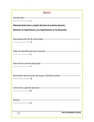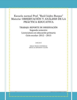 Este documento presenta un reporte de observación de una escuela primaria en Xalacapan, Puebla. Incluye información sobre la comunidad, datos de la escuela como su nombre, dirección y director, y una descripción de los estudiantes. También describe puntos clave de la gestión escolar observados como las relaciones entre maestros, el avance académico, y estrategias de enseñanza. Por último, incluye preguntas de una entrevista con el director y maestros sobre la visión, objetivos y programas de la escuela.