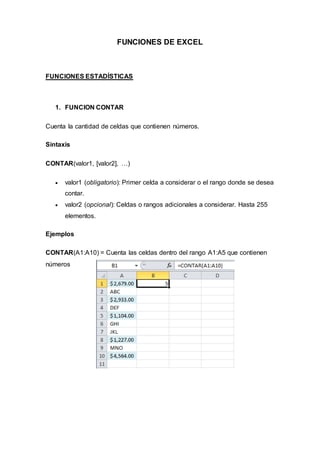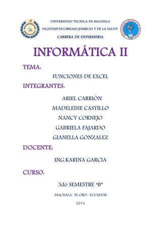 Este documento describe las principales funciones estadísticas y de búsqueda en Excel, incluyendo funciones para contar, encontrar valores máximos, mínimos y medios, y funciones para buscar valores dentro de rangos como BUSCAR, BUSCARV y BUSCARH. Fue creado por estudiantes de enfermería de la Universidad Técnica de Machala en Ecuador como parte de un curso de informática.