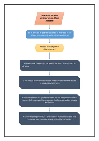 El documento describe los procedimientos para determinar la densidad de líquidos, sólidos y el agua. Se detalla que para los líquidos como el agua y el sulfato de cobre, se pesó una probeta graduada vacía y luego se añadieron volúmenes incrementales de 10 ml del líquido, pesándose después de cada adición. Para los sólidos como el hierro, se usó el principio de Arquímedes midiendo el volumen desplazado en el agua y realizando múltiples pesadas para obtener un promedio.