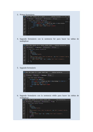 Este documento presenta una guía para una práctica de laboratorio sobre el uso de los ciclos for y while en PHP. El objetivo es comprender la sintaxis de estos ciclos mediante la creación de tablas de multiplicar. Las actividades incluyen crear archivos PHP y usar los ciclos for y while para generar las tablas.
