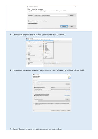 Este informe describe la segunda práctica de un estudiante en el desarrollo de un programa en Eclipse. El objetivo era conocer la entrada y salida de datos mediante el uso de tipos de datos como int, string y double. El estudiante creó un programa que imprime números enteros y decimales usando estos tipos de datos y System.out.print(). El programa se ejecutó correctamente sin errores.