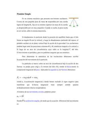 Este documento describe el movimiento oscilatorio de un péndulo simple. Explica que un péndulo simple consta de una masa suspendida por una cuerda de longitud fija. Cuando la masa se desplaza de su posición de equilibrio y luego se suelta, oscilará en un plano vertical debido a la gravedad. También describe cómo el período de oscilación de un péndulo simple depende solo de la longitud del péndulo y la gravedad, no de la masa o amplitud de oscilación. Finalmente, resume algunas aplicaciones