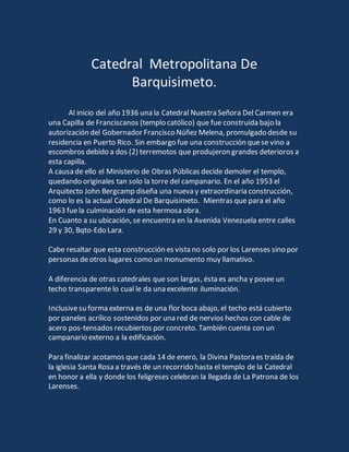 La Catedral Metropolitana de Barquisimeto comenzó como una capilla franciscana construida en 1936, pero fue destruida por dos terremotos. En 1953, el arquitecto John Bergcamp diseñó una nueva construcción ancha con un techo transparente que brinda excelente iluminación y se completó en 1963. Cada 14 de enero, la imagen de la Divina Pastora es trasladada en procesión desde la iglesia de Santa Rosa hasta la Catedral para ser honrada por los feligreses larenses.