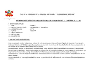 El documento presenta el informe técnico pedagógico de un profesor de aula sobre sus actividades durante el año escolar. El resumen incluye los siguientes puntos: 1) El profesor desarrolló diversas actividades para fomentar las competencias de los estudiantes de acuerdo al currículo nacional. 2) Como resultado, el profesor presenta los logros y dificultades en áreas como comunicación, matemáticas y personal-social. 3) El profesor también incluye compromisos para mejorar el aprendizaje y rendim