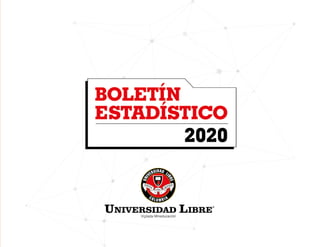 Este documento presenta el Boletín Estadístico 2020 de la Universidad Libre. Contiene información sobre la oferta académica de la universidad, el número de estudiantes, graduados, docentes y administrativos. Asimismo, incluye datos estadísticos sobre matrículas, deserción, tasas de aprobación y repetición. El boletín tiene como objetivo presentar las principales cifras del sector educativo de la Universidad Libre para el año 2020.