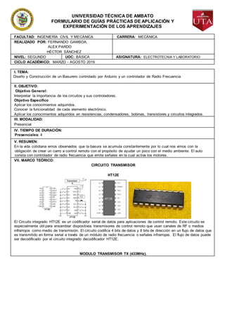 Los estudiantes diseñaron y construyeron un basurero controlado de forma remota utilizando Arduino y un controlador de radiofrecuencia. El basurero consiste en un carrito con una caja y escoba para recoger basura, con motores controlados por Arduino y pulsadores de radiofrecuencia. El objetivo era aplicar conocimientos electrónicos para crear un dispositivo que ayude a mantener limpio el medio ambiente.
