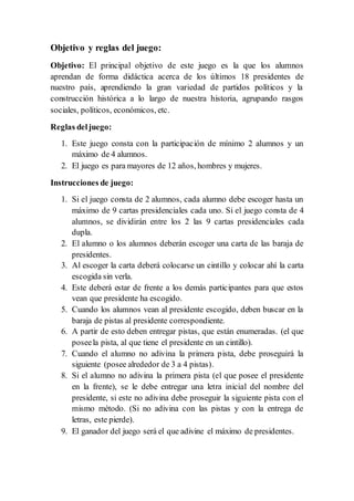 Este documento presenta las reglas y objetivos de un juego educativo sobre los últimos 18 presidentes de un país. El objetivo principal es que los estudiantes aprendan acerca de los presidentes, partidos políticos e historia del país de una manera didáctica. El juego involucra de 2 a 4 jugadores que deben adivinar presidentes escogiendo cartas y recibiendo pistas uno del otro hasta adivinarlos. Gana el jugador que adivine la mayor cantidad de presidentes.