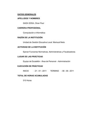 El documento presenta un informe de prácticas profesionales realizadas en la Oficina de Administración - Área de Personal de la Unidad de Gestión Educativa Local "Mariscal Nieto". El informe incluye información sobre la institución como su nombre, ubicación, misión y visión. También describe las tareas realizadas en el Área de Personal durante las prácticas, los conocimientos adquiridos y los resultados obtenidos.