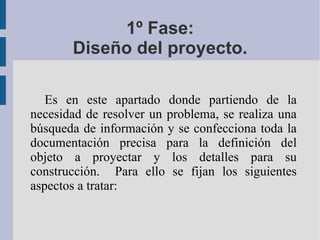 Este documento describe los pasos para elaborar un informe de proyecto en tecnología. El proyecto tiene dos fases: diseño y construcción. En la fase de diseño se define el problema, se busca información, y se proponen y eligen soluciones. Esto resulta en documentos técnicos como planos y presupuestos. En la fase de construcción se fabrica el objeto usando materiales y herramientas del aula. El informe incluye una portada, índice, memoria descriptiva, cálculos, planos, presupuestos