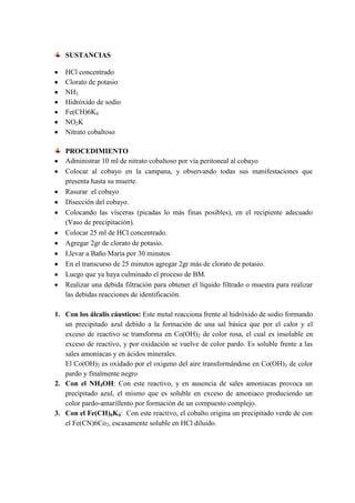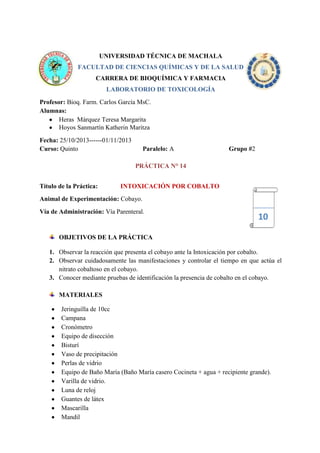 1. Las estudiantes Teresa Heras y Katherin Hoyos realizaron una práctica de laboratorio sobre la intoxicación por cadmio en cobayos. 2. Administraron cadmio por vía peritoneal a un cobayo y observaron que presentó inmovilidad y perdida de equilibrio, muriendo a los 2 minutos. 3. Mediante reacciones químicas comprobaron la presencia de cadmio en las vísceras del cobayo.