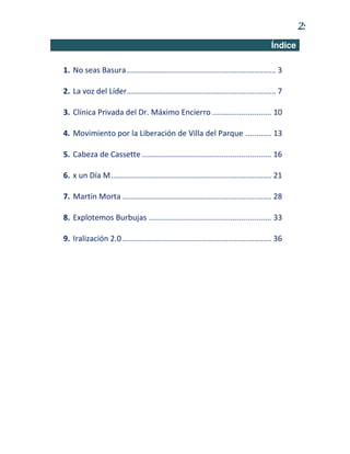 Este documento describe un proyecto llamado "No seas basura" que tiene como objetivo concientizar sobre el problema de la basura en las ciudades a través de una campaña viral en redes sociales. El proyecto presenta un tacho de basura portátil ficticio llamado "Trashman" para generar discusión sobre soluciones reales, que implican un cambio de comportamiento más que productos. La campaña usa redes como Facebook, Twitter y blogs para difundir el mensaje de manera simple y emocional. El objetivo final es modificar actitudes individualistas sobre el