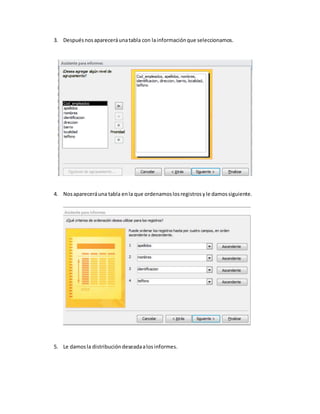 El documento describe los pasos para generar informes a partir de tablas de datos, incluyendo seleccionar una tabla, elegir los campos de información requeridos, ordenar registros, asignar un título y finalizar el informe. Proporciona ejemplos de informes como clientes, empleados, inventario y productos.
