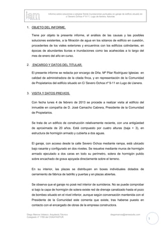 Este informe resume las causas de las inundaciones periódicas en el garaje de un edificio en Lugo de Llanera, Asturias y propone soluciones. Las filtraciones se producen cuando llueve mucho y sobrepasa la capacidad del alcantarillado, entrando agua por agujeros sin sellar en los muros y por una puerta deteriorada. Se propone sellar los agujeros y añadir una bomba de agua para evacuar el agua acumulada.