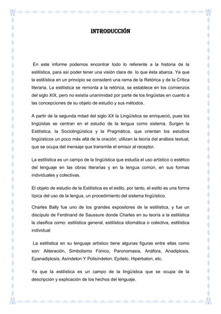 El informe presenta la historia y el objeto de estudio de la estilística, que se centra en el uso artístico del lenguaje en la literatura y la lengua común. Se discute la evolución de la estilística desde la retórica, incluyendo definiciones clave y figuras retóricas, así como su relevancia para el desarrollo de la inteligencia lingüística de los estudiantes. Finalmente, se enfatiza la importancia de entender el estilo como un conjunto de rasgos que reflejan la individualidad del autor en su expresión literaria.