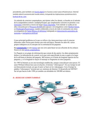 La historia de Internet se remonta al desarrollo temprano de las redes de comunicación y la primera conexión entre computadoras ocurrió en 1969 entre las universidades de Stanford y UCLA, dando origen a ARPANET. El correo electrónico fue desarrollado por primera vez en 1971 por Ray Tomlinson y utilizó el símbolo "@" para separar el nombre de usuario del nombre del equipo. La infraestructura de Internet se expandió por el mundo para crear la red mundial de computadoras que