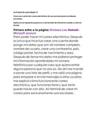 El documento describe cómo un estudiante creó una cuenta de correo electrónico en el servidor Windows Live Hotmail de Microsoft para uso escolar. El estudiante ingresó a la página de Windows Live Hotmail, proporcionó información personal como nombre, usuario, contraseña, país y fecha de nacimiento, y también dio su número de teléfono para proteger su cuenta. Luego de crear su perfil con foto, el estudiante ahora puede enviar y recibir mensajes con su nueva cuenta de correo exclusiva para labores escolares.